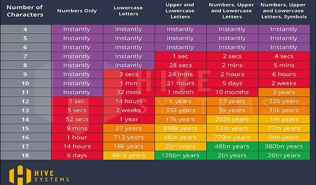 وبينما تستغرق كلمة المرور المكونة من 11 حرفًا 30 دقيقة فقط ، إلا أن إضافة 7 أحرف صغيرة أخرى سيجعل المتسلسل يستغرق أكثر من 480 ألف عام لفك شفرتها، كلمات المرور الأكثر أمانًا هي تلك التي تحتوي على مزيج من الأرقام والرموز والحروف الكبيرة والصغيرة وأيضا الطويلة جدا.