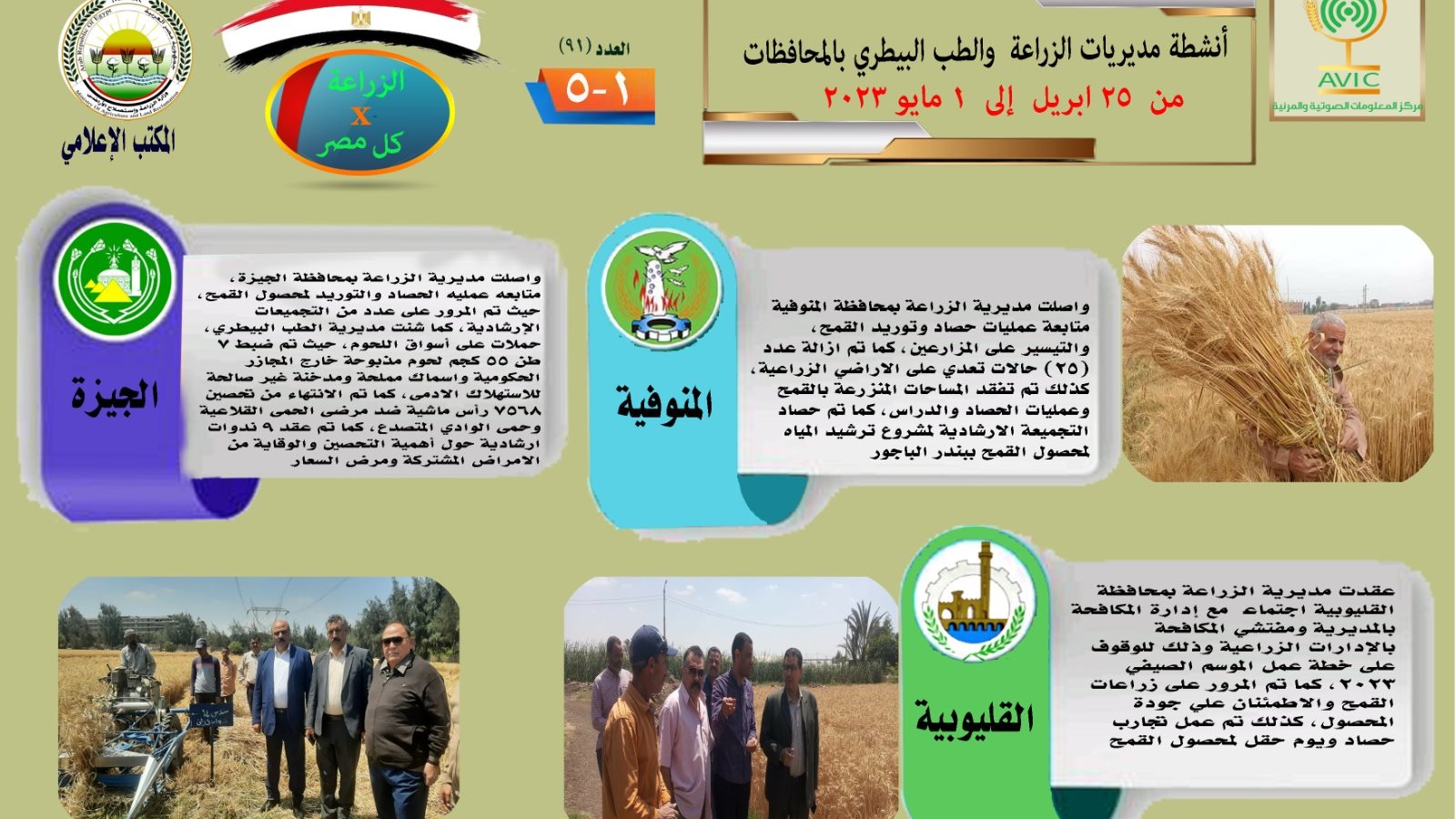 أصدر مركز المعلومات الصوتية والمرئية التابع لوزارة الزراعة واستصلاح الأراضي، والمكتب الإعلامي للوزارة، العدد رقم ٩٥ من إصدار: "الزراعة في كل مصر" بالانفوجراف والفيديو، يوضح الجهود والأنشطة التي تقوم بها مديريات الزراعة والطب البيطري بمحافظات الجمهورية خلال الفترة من ٢٥ أبريل وحتى ١ مايو الجاري.