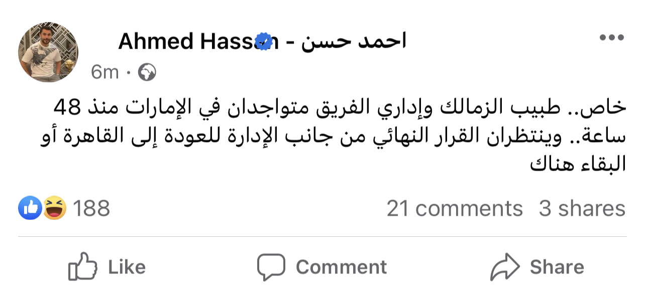 وكتب أحمد حسن: “خاص.. طبيب الزمالك وإداري الفريق متواجدان في الإمارات منذ 48 ساعة.. وينتظران القرار النهائي من جانب الإدارة للعودة إلى القاهرة أو البقاء هناك”.