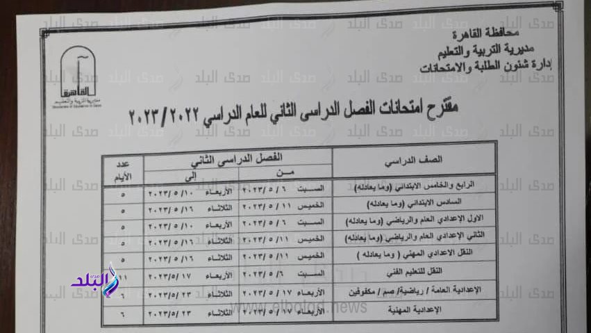 - تعقد امتحانات الصف الثالث الإعدادي يوم الأربعاء الموافق 17/5/2023 والتجمع في المطبعة السرية فجر اليوم نفسه.