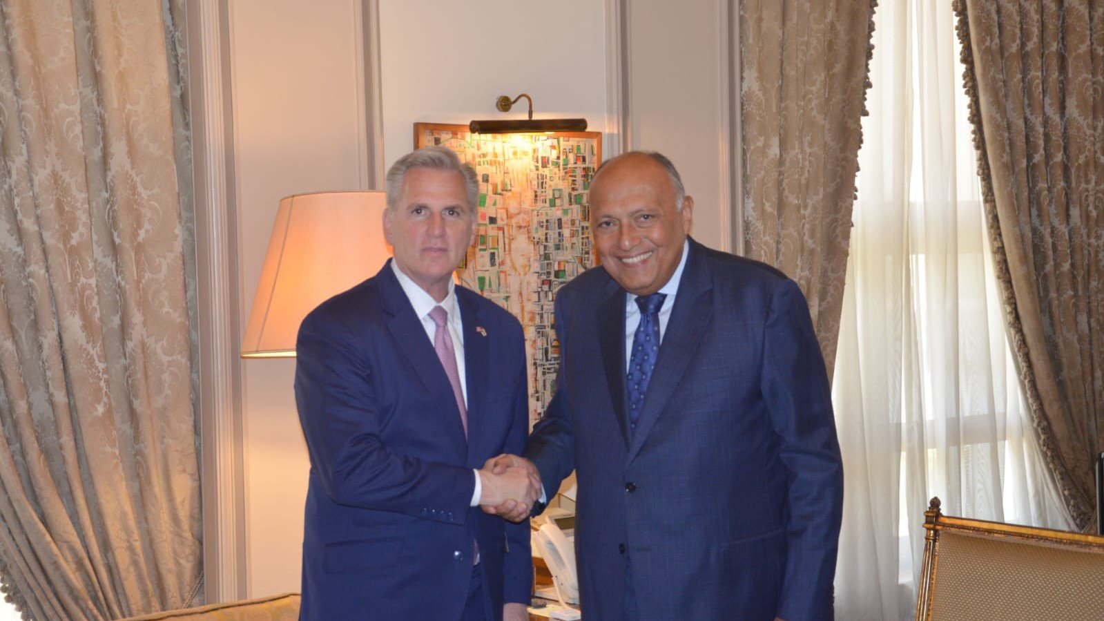 استقبل سامح شكري وزير الخارجية، اليوم، وفداً من الكونجرس الأمريكي برئاسة كيفين مكارثي رئيس مجلس النواب الأمريكي، حيث تم عقد جلسة ثنائية مغلقة، أعقبها مباحثات موسعة بمشاركة وفدي البلدين.