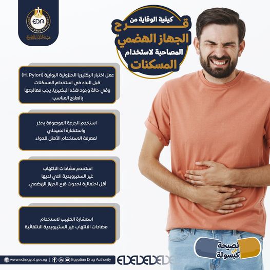 أوضحت هيئة الدواء المصرية بعض الطرق للوقاية من قرح الجهاز الهضمي المصاحبة لاستخدام المسكنات غير الستيرويدية.