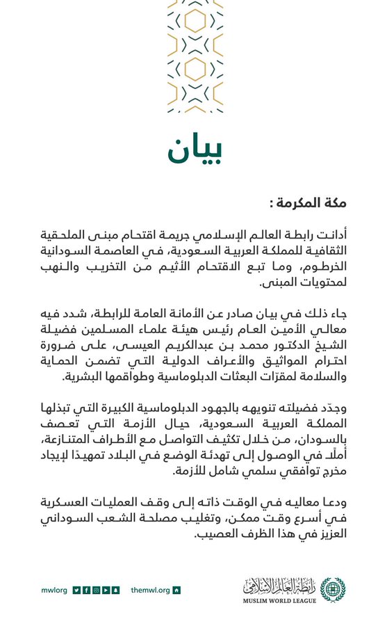 أدانت رابطة العالم الإسلامي، اليوم الخميس، تعرض مبنى الملحقية الثقافية السعودية في السودان لاقتحام من قبل مجموعة مسلحة وقامت بالإستيلاء على الممتلكات وتخريبها.