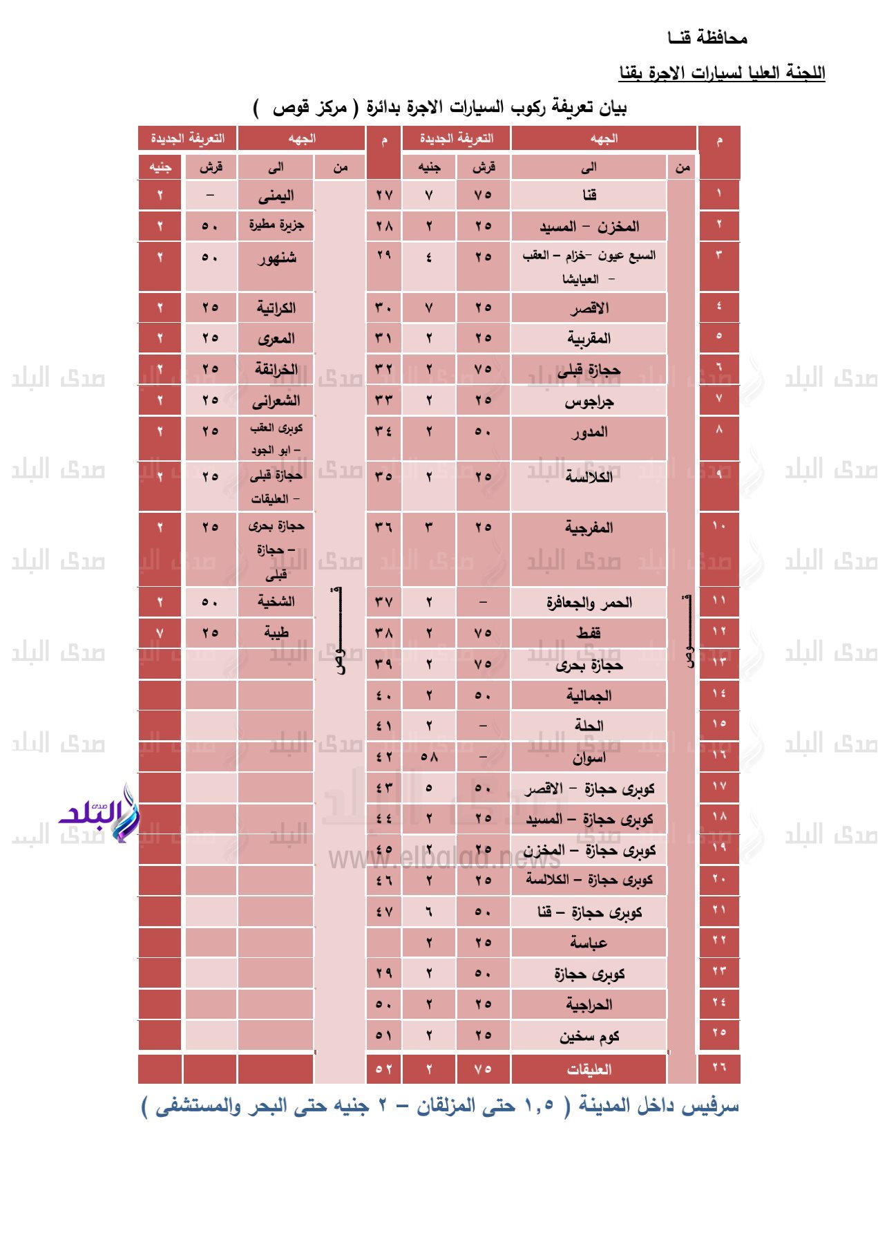 وقال اللواء أشرف الداودى، محافظ قنا، تم التنبيه على مسئولىإدارتي المرور والمواقف بشن حملات مرورية علي جميع ميادين ومواقف المحافظة علي مدار اليوم، للتأكد من التزام السائقين بتطبيق تعريفة الركوب الجديدة.
