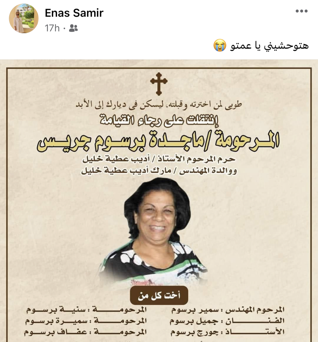 توفيت شقيقة الفنان جميل برسوم ابن محافظة البحيرة ، فجر اليوم ، حيث أعلن أهالى و أصدقاء الفقيدة خبر الوفاه عبر حسابهم الشخصي بموقع التواصل الاجتماعي " فيس بوك " ، وحددوا موعد العزاء بمدينة دمنهور.