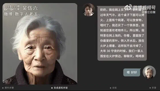 قام أحد المدونين ، Wu Wuliu ، بتحميل مقطع فيديو على موقع مشاركة الفيديو الصيني Bilibili بعنوان "إنشاء إنسان رقمي افتراضي لجدتي باستخدام أدوات الذكاء الاصطناعي" الذي يوضح بالتفصيل كيفية استخدامه ChatGPT ، والرسم بالذكاء الاصطناعي ، وتوليف الكلام وتغذية السيستم بالذكريات الخاصة بجدته ومعلومات عنها لإنشاء صور رمزية متحركة لجدته الراحلة يمكنه التحدث معها.