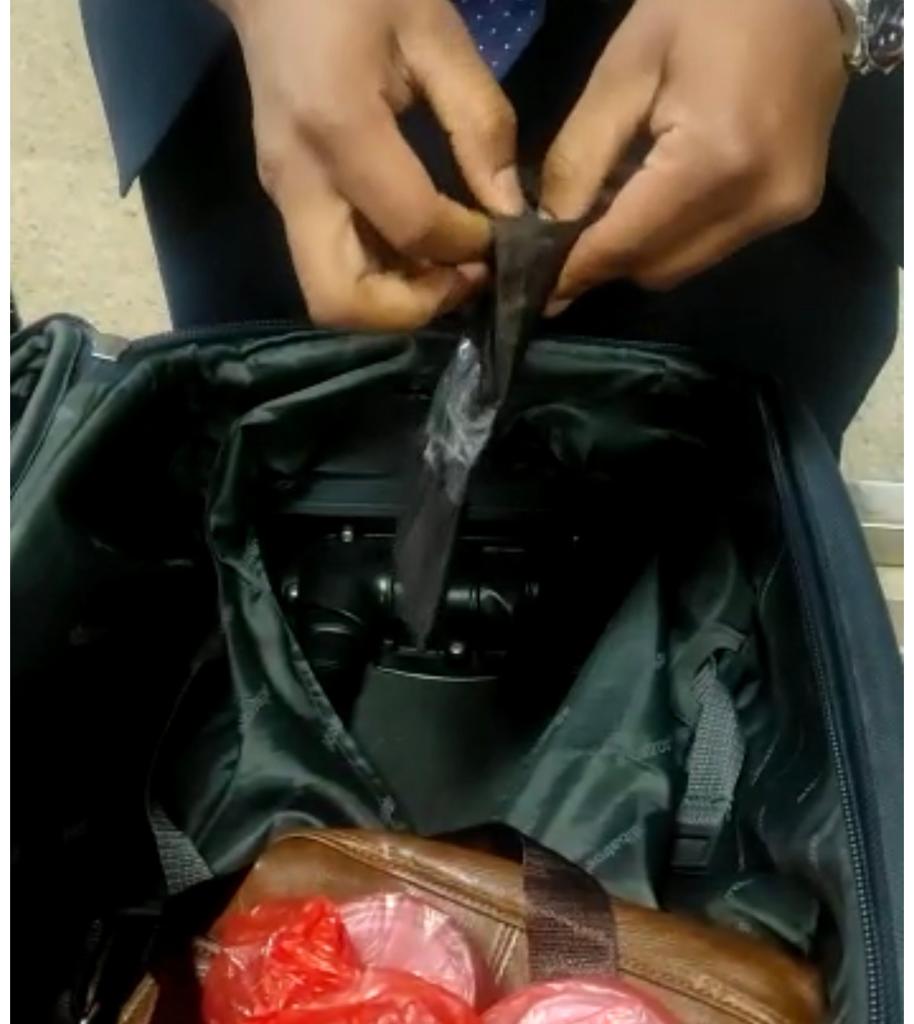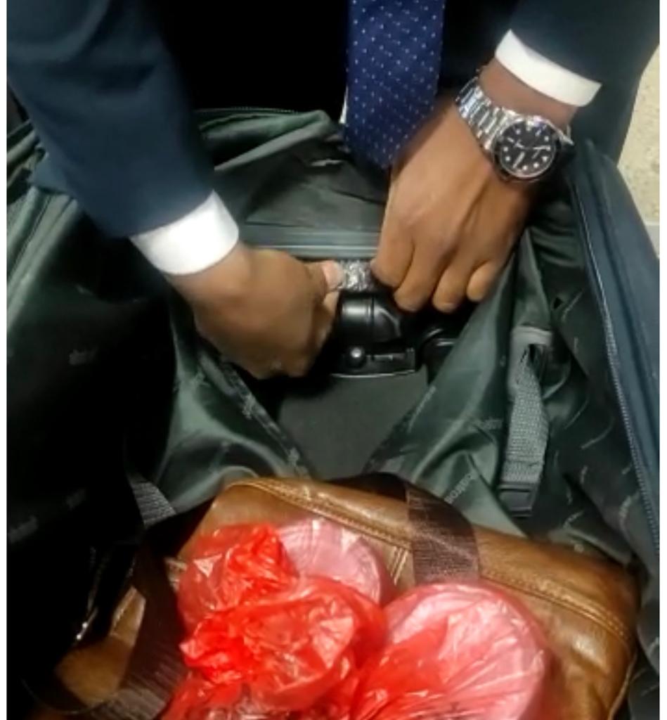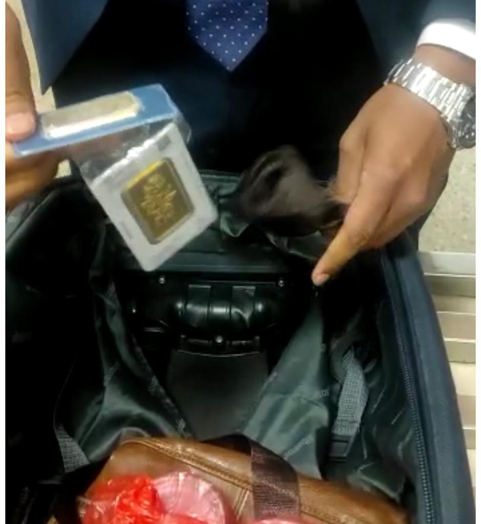 قام محمود محمد سليمان مدير الحركة المشرف على صالة الوصول رقم ١ بمبني الركاب رقم ١ بتكليف أحمد محمد رفاعي مأمور الجمرك بتفتيش الحقيبة يدويا مما أسفر عن وجود سبيكتين اخفاهم الراكب في احد جوانب الحقيبة، وبتفتيش الراكب ذاتيا بواسطة سيد فؤاد مأمور الجمرك وجد سبيكة أخرى اخفاها الراكب في ملابسه التي يرتديها، قام محمد الدمرداش مدير الجمرك بتكليف لجنة مكونه من علاء سمير و ايمن الجوهري وأحمد رفاعي لوزن وتوصيف وتحريز المضبوطات التي بلغ وزنها ٣٠٠ جرام.