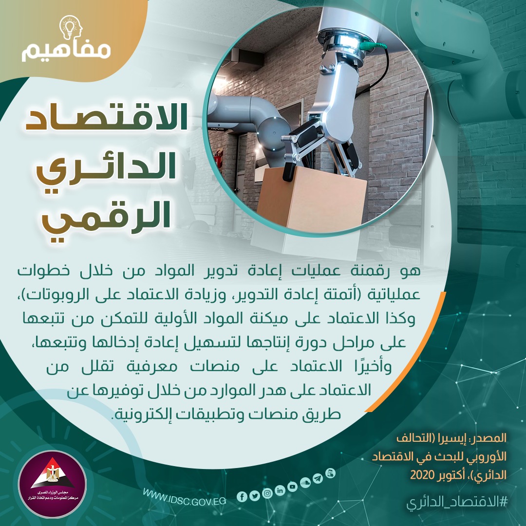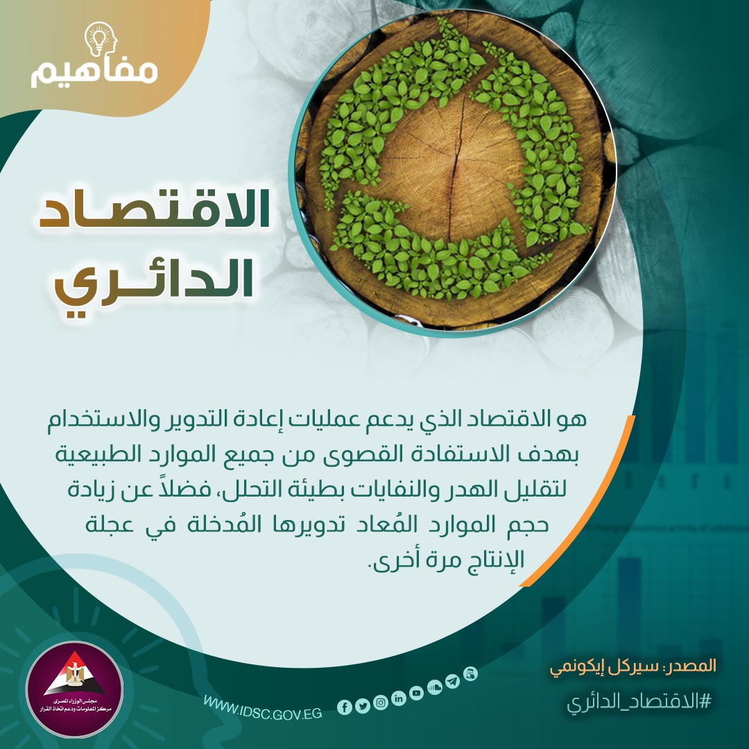 أطلق مركز المعلومات ودعم اتخاذ القرار بمجلس الوزراء عددًا من الإنفوجرافات والفيديوهات حول "الاقتصاد الدائري"، الذي يدعم العمل في مجالات حماية البيئة والمناخ والتحول لاقتصادات خضراء مستدامة، من خلال عمليات إعادة التدوير والاستخدام بهدف تحقيق الاستفادة القصوى من جميع الموارد الطبيعية لتقليل الهدر والنفايات.