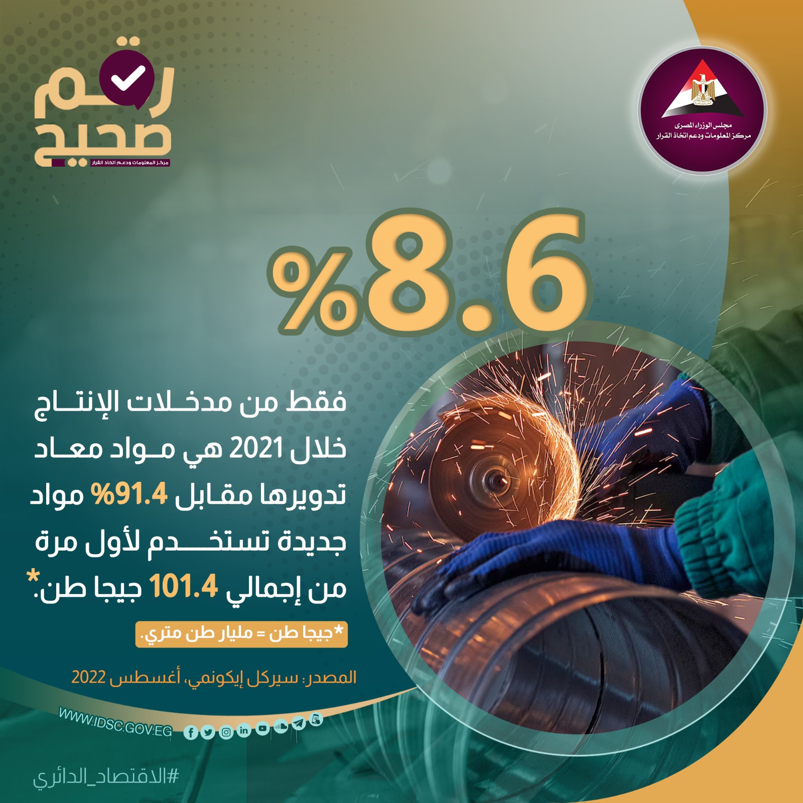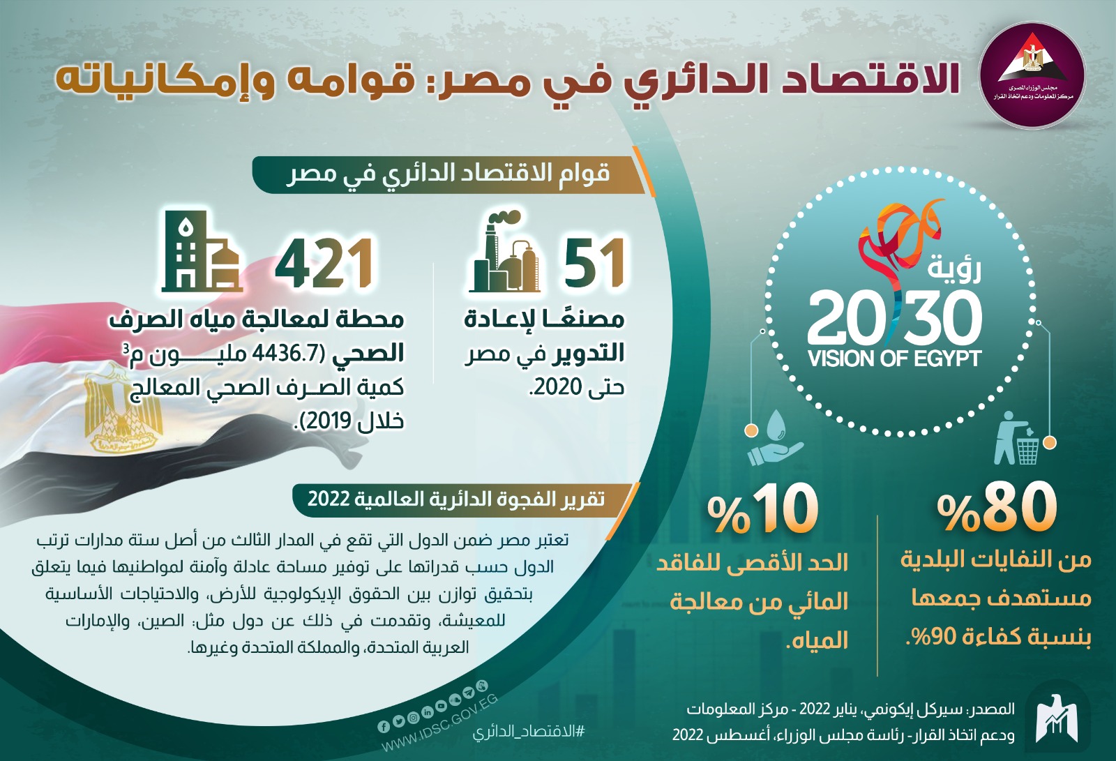 ومحليًّا، تطرقت الإنفوجرافات، إلى أن الاقتصاد الدائري كان ضمن أبعاد رؤية مصر 2030 والتي تستهدف 80% من النفايات البلدية المستهدف جمعها بنسبة كفاءة 90%، بالإضافة إلى تحديد 10% الحد الأقصى للفاقد المائي من معالجة المياه، حيث يتكون قوام الاقتصاد الدائري في مصر من 51 مصنعًــا لإعـادة التدوير، و421 محطة لمعالجة مياه الصرف الصحي، وهو ما جعل مصر تتقدم في الترتيب العالمي في ذلك المجال مقارنة بدول، مثل: الصين، والإمارات، والمملكة المتحدة وغيرها.
