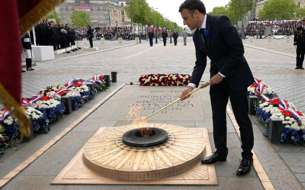 ووصل ماكرون، اليوم الاثنين، إلى قوس النصر في الشانزليزيه في باريس، لحضور حفل النصر المقرر إقامته في تمام الساعة 11 صباحًا، من أجل وضع إكليل من الزهور على تمثال الزعيم الراحل مؤسس الجمهورية الفرنسية الخامسة شارل ديجول، ثم يضع إكليلا من الزهور على قبر الجندي المجهول تحت قوس النصر.