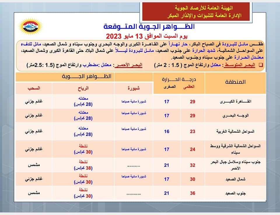 ونوهت بأن درجات الحرارة ستتجه إلى الارتفاع، بداية من الغد، لتصل إلى ذروتها يومي الثلاثاء والأربعاء، وتسجل 35 درجة مئوية على القاهرة الكبرى.