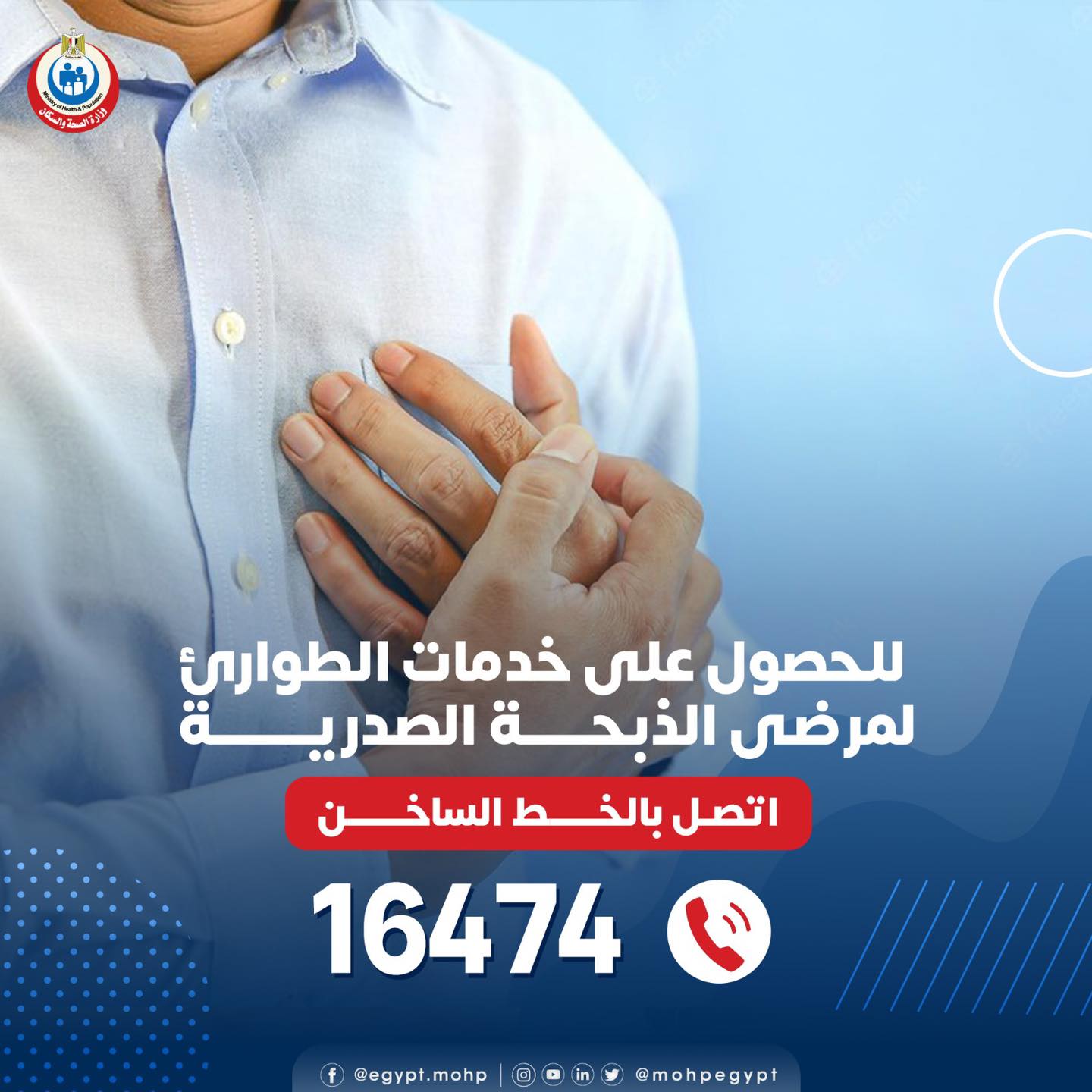 وقالت وزارة الصحة والسكان ، إنه للحصول علي الخدمات لمرضي طوارئ الذبحة الصدرية يرجى الاتصال بالخط الساخن: ١٦٣٢٨
