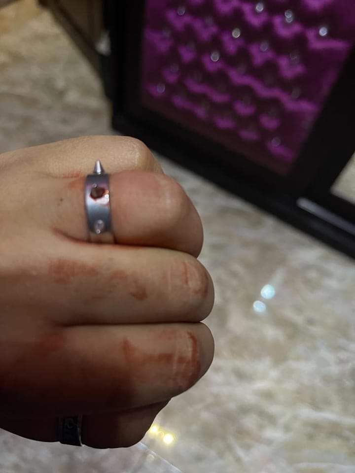 أولا ده لا يندرج تحت مسمى سلاح لإنه ببساطة خاتم عادي، كمان الخاتم مش حاد خالص وانا بلبسه اكسسوري عادي بس انا مدربة وبلعب بوكس ففي حاجه اسمها نقط ضعف وبكل بساطة أنا ضربته في مناخيره وده كان سبب النزيف مش الخاتم خالص".