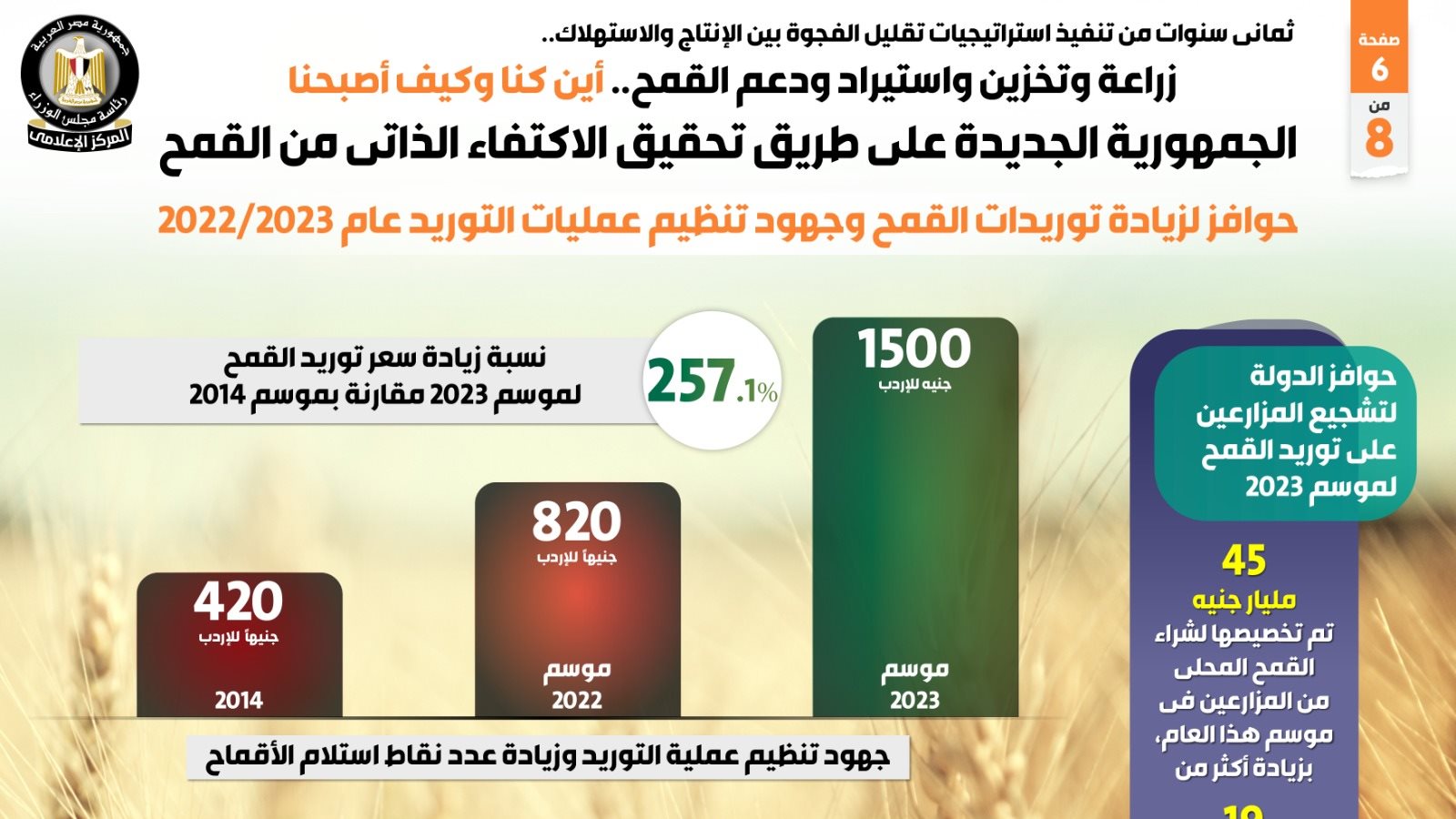 وفي هذا الصدد نشر المركز الإعلامي لمجلس الوزراء تقريراً ضمن سلسلة أين كنا وكيف أصبحنا، تضمن إنفوجرافات تسلط الضوء على جهود زراعة وتخزين واستيراد ودعم القمح، وجهود الجمهورية الجديدة على طريق تحقيق الاكتفاء الذاتي منه، بعد ثمان سنوات من تنفيذ استراتيجيات تقليل الفجوة بين الإنتاج والاستهلاك.