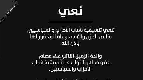 نعت تنسيقية شباب الأحزاب والسياسيين، والدة الزميل النائب علاء عصام عضو مجلس النواب عن تنسيقية شباب الأحزاب والسياسيين.