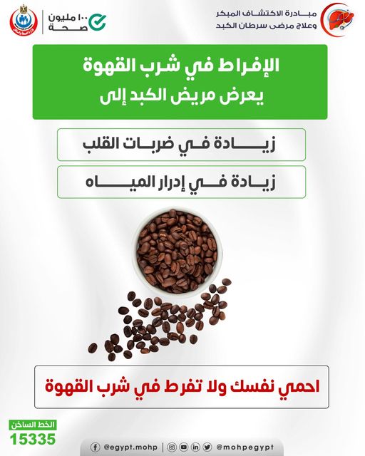 قالت وزارة الصحة والسكان ، إن الإفراط في شرب القهوة يعرض مريض الكبد لبعض المخاطر منها، زيادة في ضربات القلب وإدرار المياه، مشددة على ضرورة الحماية وعدم الإفراط في شرب القهوة.