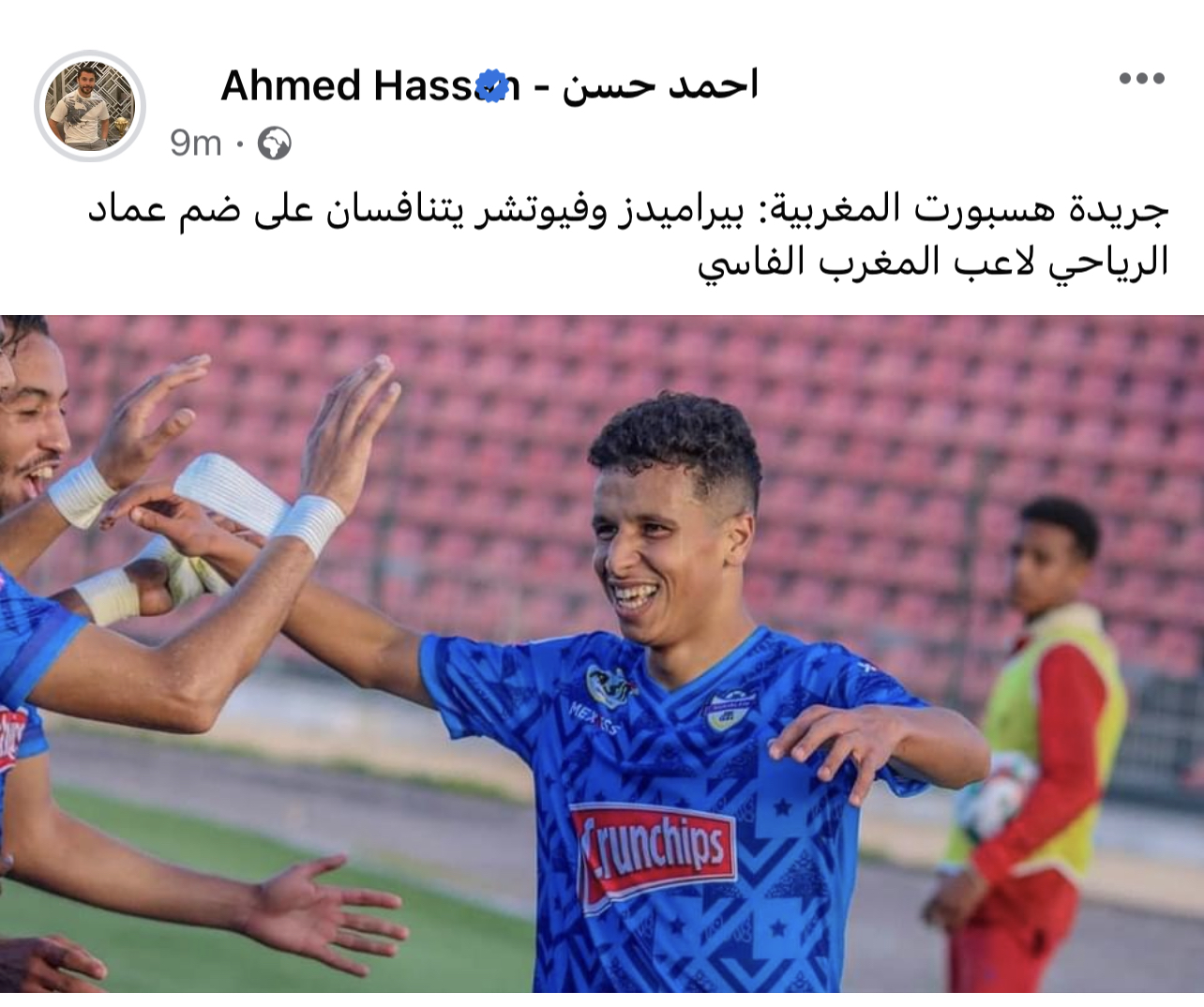 وكتب أحمد حسن، عبر حسابه الشخصي بموقع التواصل الاجتماعي “ فيسبوك: “جريدة هسبورت المغربية: بيراميدز وفيوتشر يتنافسان على ضم عماد الرياحي لاعب المغرب الفاسي”.