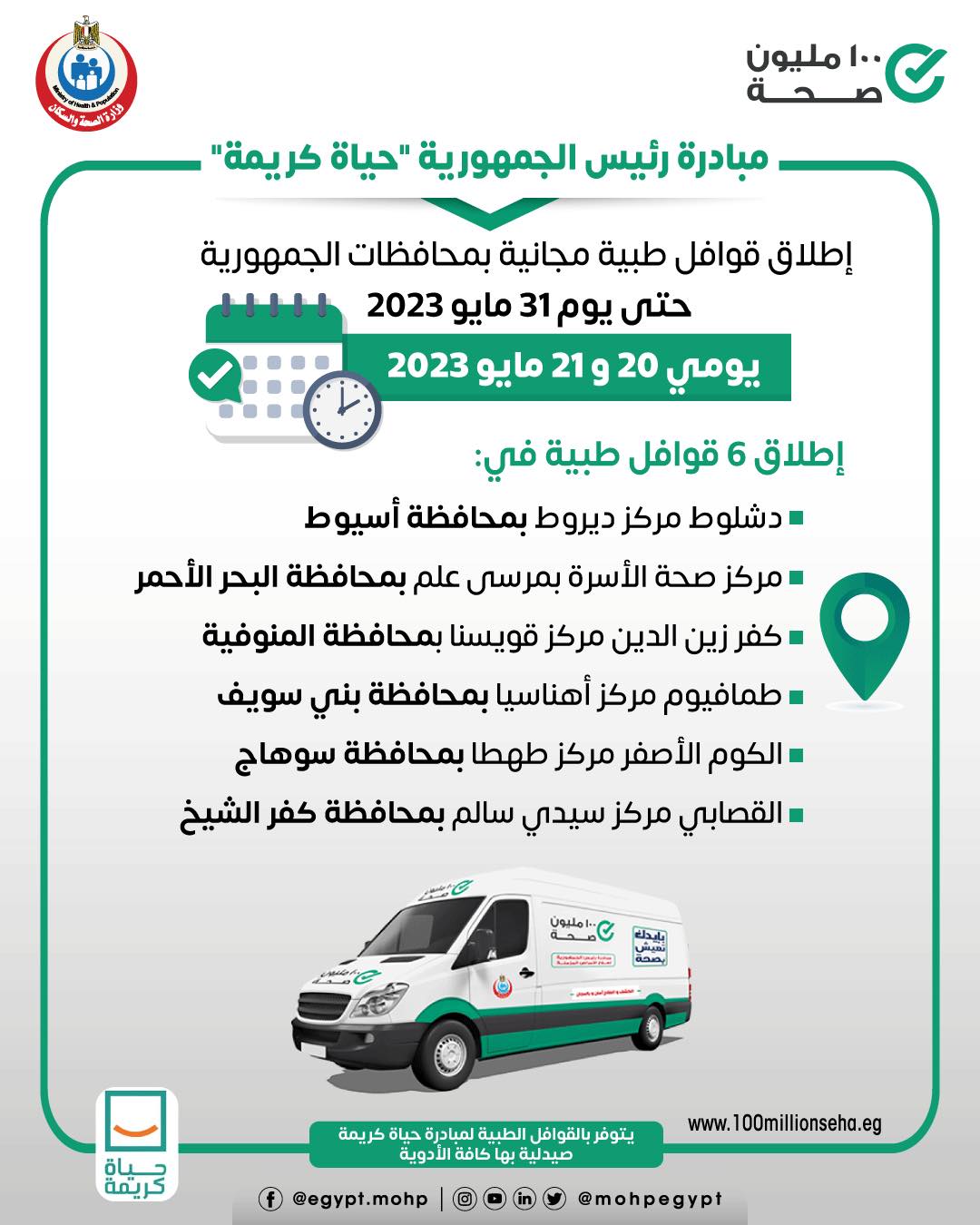 أعلنت وزارة الصحة والسكان إطلاق 6 قوافل طبية ضمن مبادرة رئيس الجمهورية «حياة كريمة»، وذلك يومي 20 و21 مايو 2023 للكشف والعلاج مجانًا.