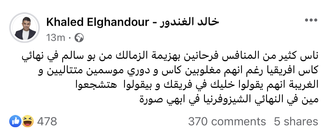 وكتب خالد الغندور: “ناس كثير من المنافس فرحانين بهزيمة الزمالك من بو سالم في نهائي كاس افريقيا رغم انهم مغلوبين كاس ودوري موسمين متتاليين والغريبة انهم يقولوا خليك في فريقك و بيقولوا هتشجعوا مين في النهائي الشيزوفرنيا في ابهي صورة”.
