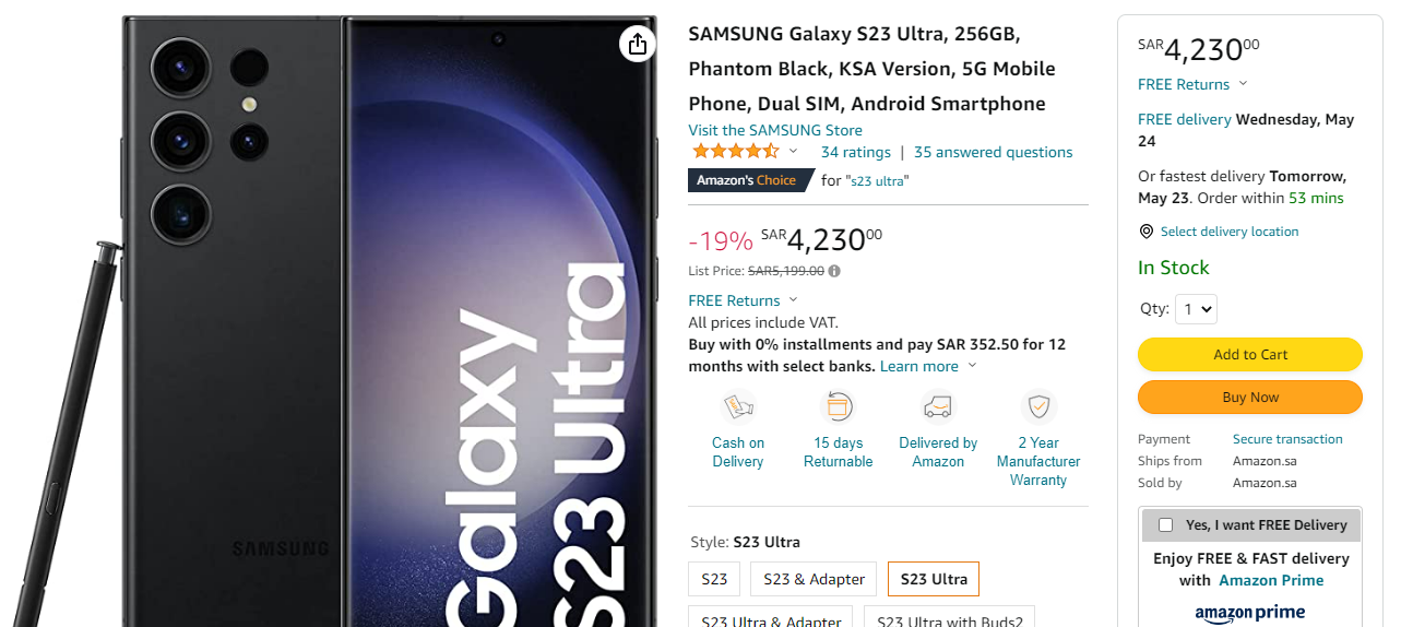 ويتوفر جوال سامسونج جالاكسي إس 23 ألترا على منصة أمازون المملكة العربية السعودية بخصم كبير يصل لـ 19% وهو معروض للبيع حاليا بسعر 4230 ريال سعودي فقط، مع تكوين الذاكرة وسعة التخزين 256 جيجابايت روم، 8 جيجابايت رام.
