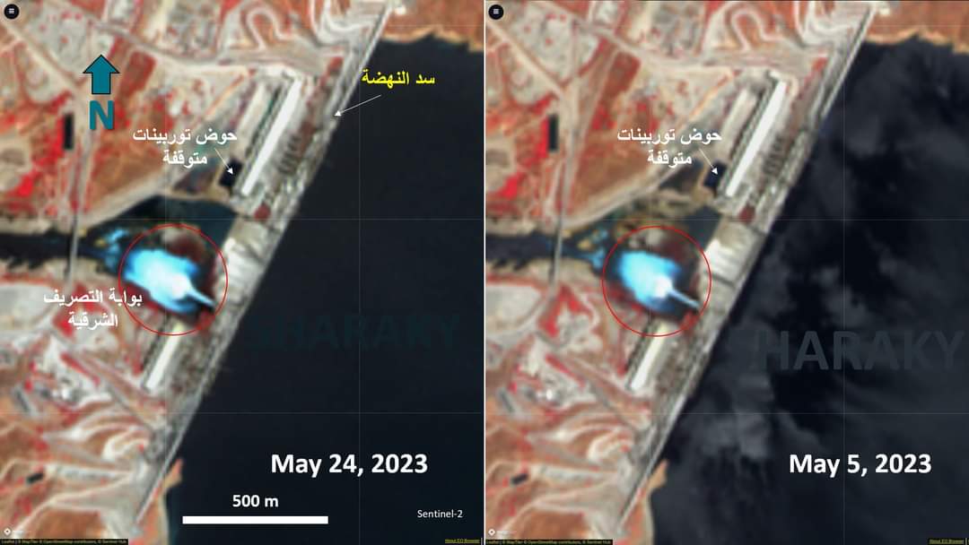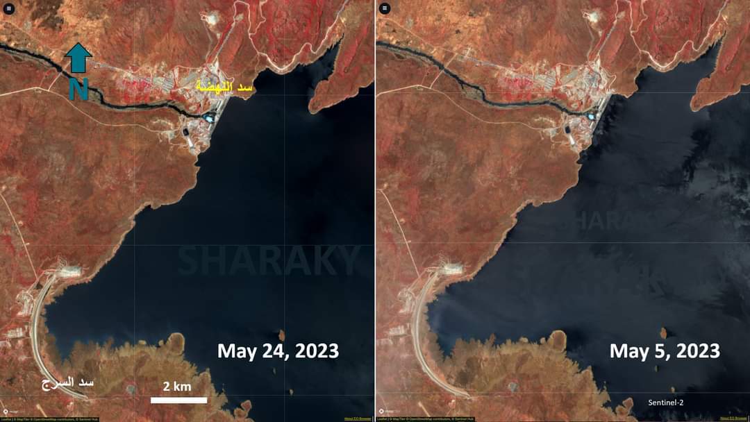 قال الدكتور عباس شراقي أستاذ الموارد المائية بجامعة القاهرة، إن منسوب بحيرة سد النهضة قد انخفض خلال الشهور الماضية بمقدار 10 م عن أعلى منسوب في سبتمبر 2022 وظل هذا دون تغيير واضح خلال مايو نظراً لتساوى الايراد عند سد النهضة 22 مليون م3/يوم مع المنصرف من بوابة التصريف الشرقية رغم زيادة فتحها خلال الأسبوعين الماضيين بعد الإشارة إلى انخفاض مخزون سد الروصيرص وانحسار والتخوف من تأثير المياه المنصرفة القليلة على محطات الشرب في السودان.