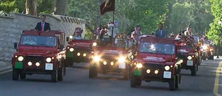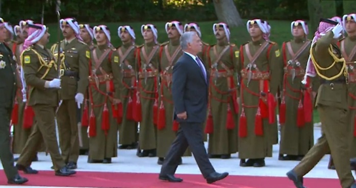 واستعرض الملك عبدالله الثاني حرس الشرف الذي اصطف لتحيته بعد أن وصل محاطا بالموكب الأحمر إلى قصر رغدان العامر.