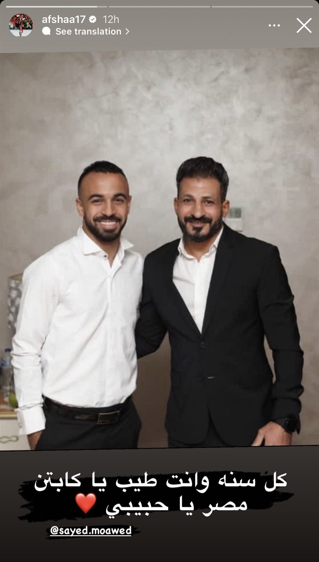 ونشر أفشة صورة برفقه سيد معوض، عبر خاصية “الاستوري”، وعلق كاتبًا: “كل سنة وانت طيب يا كابتن مصر يا حبيبي”.