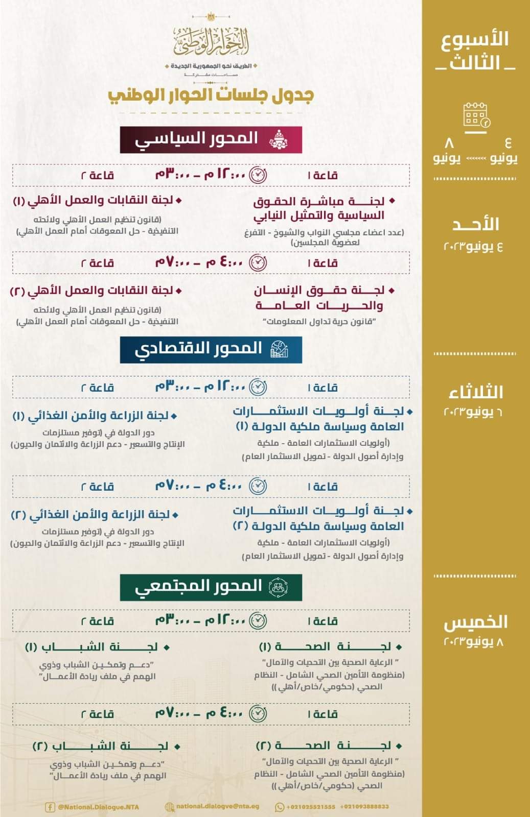ويناقش جدول أعمال الحوار الوطني للأسبوع الثالث؛ يوم الأحد الموافق 4 يونيو، جلسة نقاشية حول عدد أعضاء مجلسي النواب والشيوخ بالإضافة إلى قضية التفرغ لعضوية المجلسين والمدرجة على جدول أعمال لجنة مباشرة الحقوق السياسية والتمثيل النيابي.