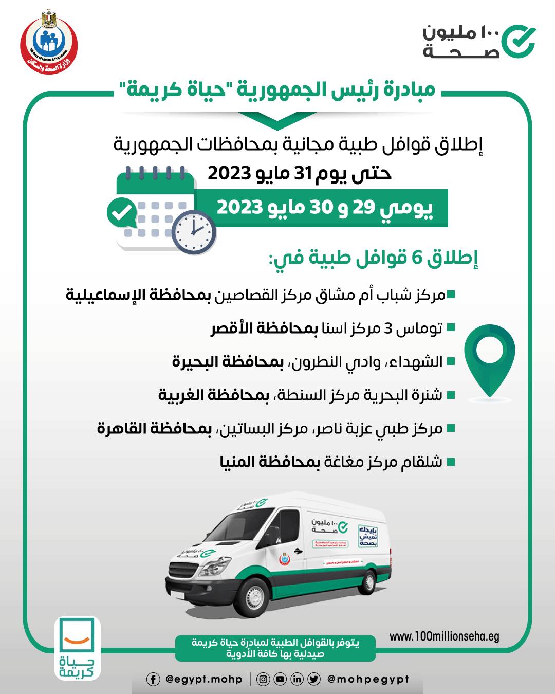 أعلنت وزارة الصحة والسكان ، إطلاق ٦ قوافل طبية ضمن مبادرة رئيس الجمهورية حياة كريمة، وذلك يومي ٢٩ و ٣٠ مايو ٢٠٢٣ للكشف والعلاج مجانًا.