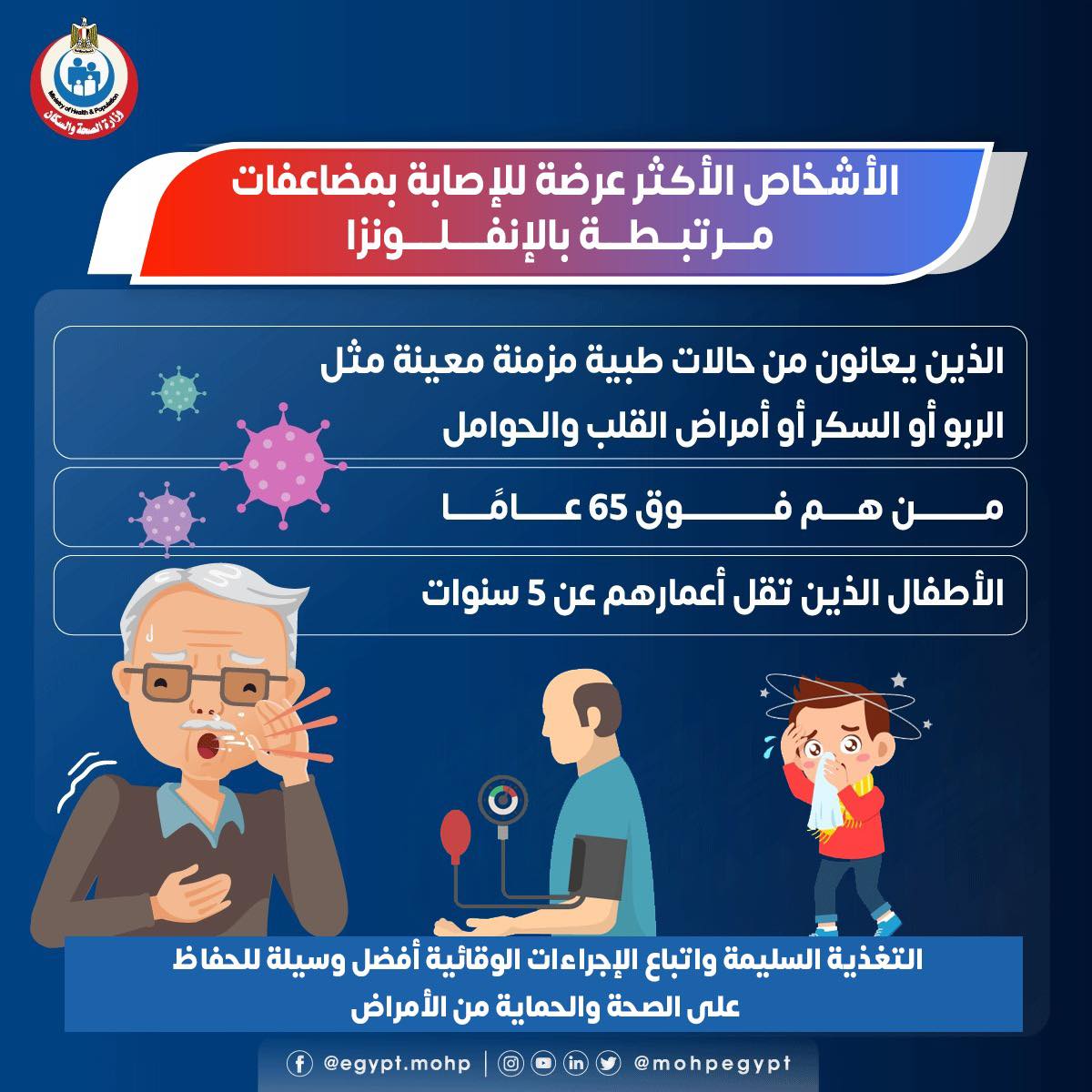 وأوضحت وزارة الصحة والسكان، إن من ضمن الأشخاص الأكثر عرضة للإصابة بمضاعفات مرتبطة بالإنفلونزا، من هم فوق 65 عاما، أو الأطفال الذين تقل أعمارهم عن 5 سنوات .