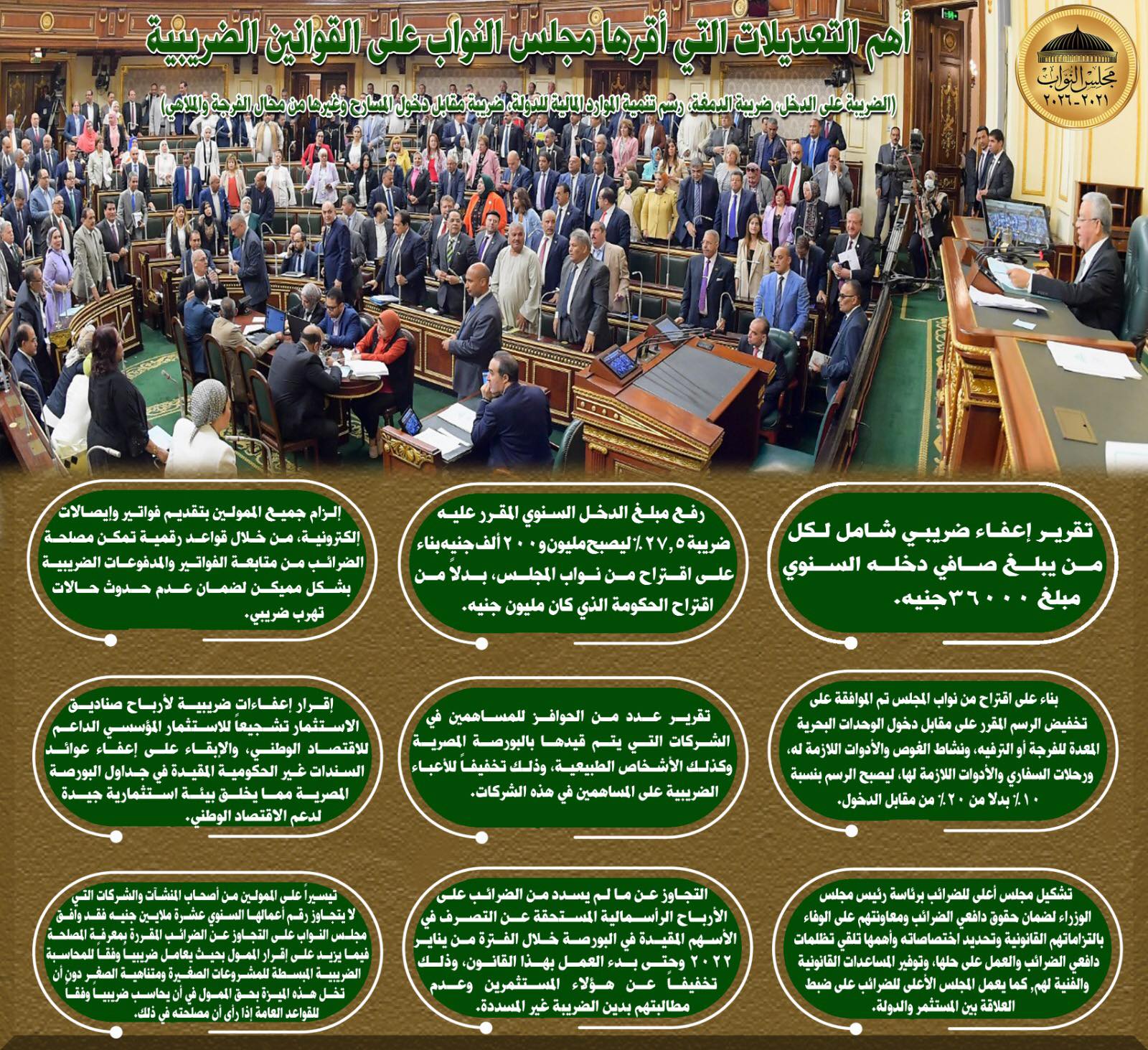 وأقر مجلس النواب زيادة الحد الأدنى للإعفاء الضريبي، حيص وصل إلى 36 ألف جنيه، وهذا يعني أن كل من يصل دخله السنوي أو المرتبات 36 ألف جنيه بما يعادل 3000 جنيه شهريًا يكون معفيًا بشكل رسمي من ضريبة الدخل.