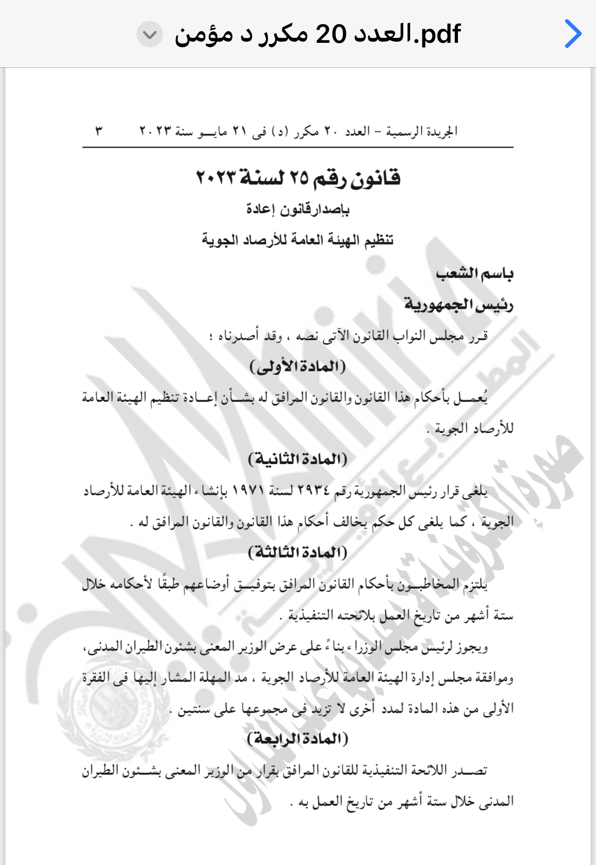 وقع الرئيس عبد الفتاح السيسي علي عدة قوانين بعد موافقة مجلس النواب منها قانون رقم 25 لسنة 2023 بغصدار قانون إعادة تنظيم الهيئة العامة للأرصاد الجوية.
