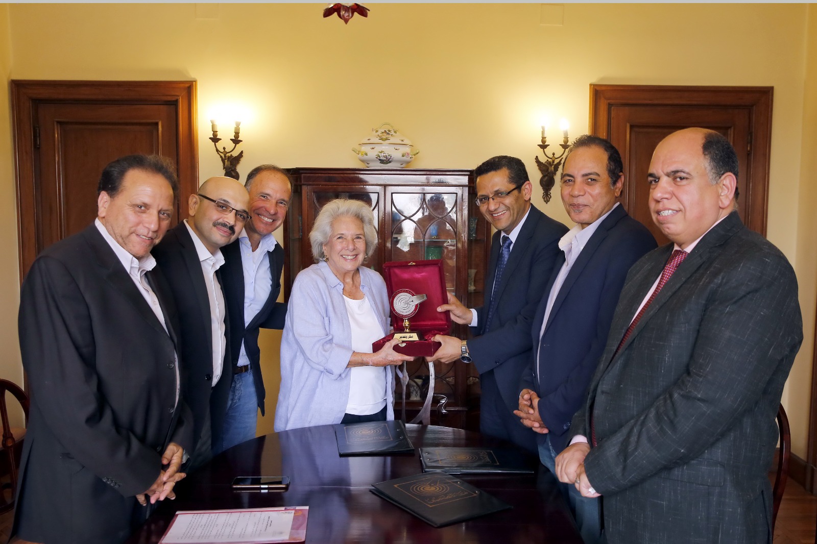 وسلم نقيب الصحفيين درع النقابة إلى السيدة تيمور تقديرا لدعمها وجهودها فى تطوير مهارات الصحفيين من خلال مؤسسة هيكل للصحافة العربية.