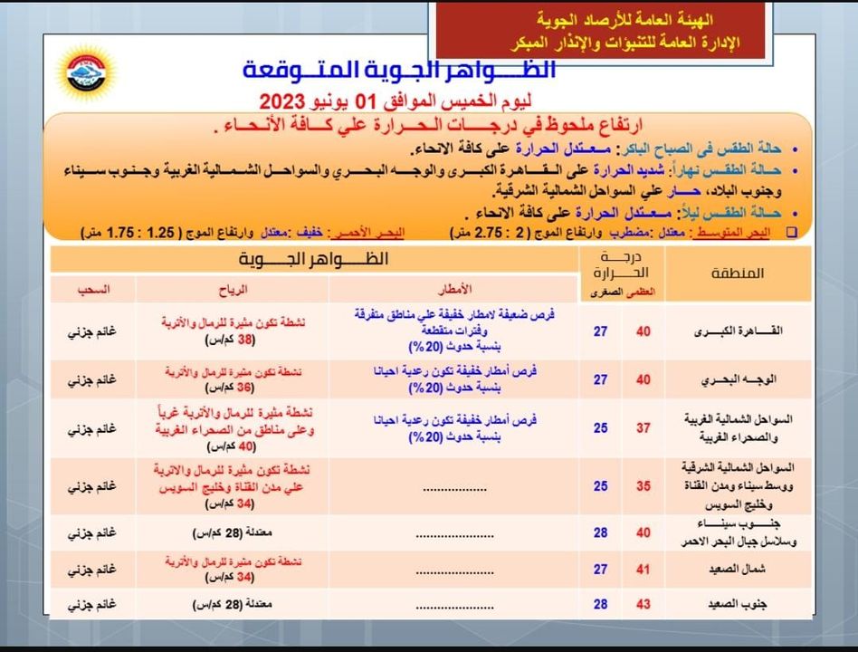 وبحسب نشرة الأرصاد، تسجل درجة الحرارة العظمى على القاهرة الكبرى ستصل إلى 40 درجة مئوية، فضلا عن أجواء شديدة الحرارة نهارا معتدلة خلال فترات الليل.