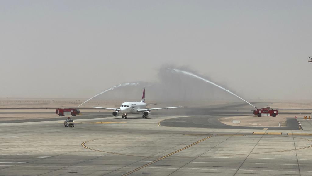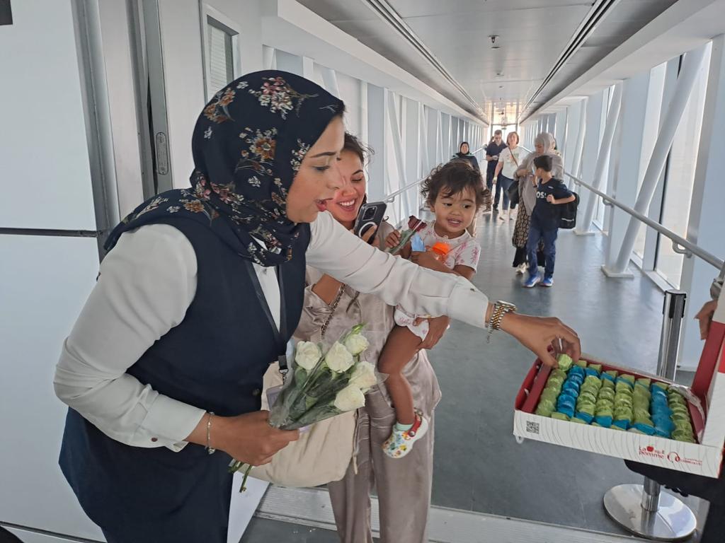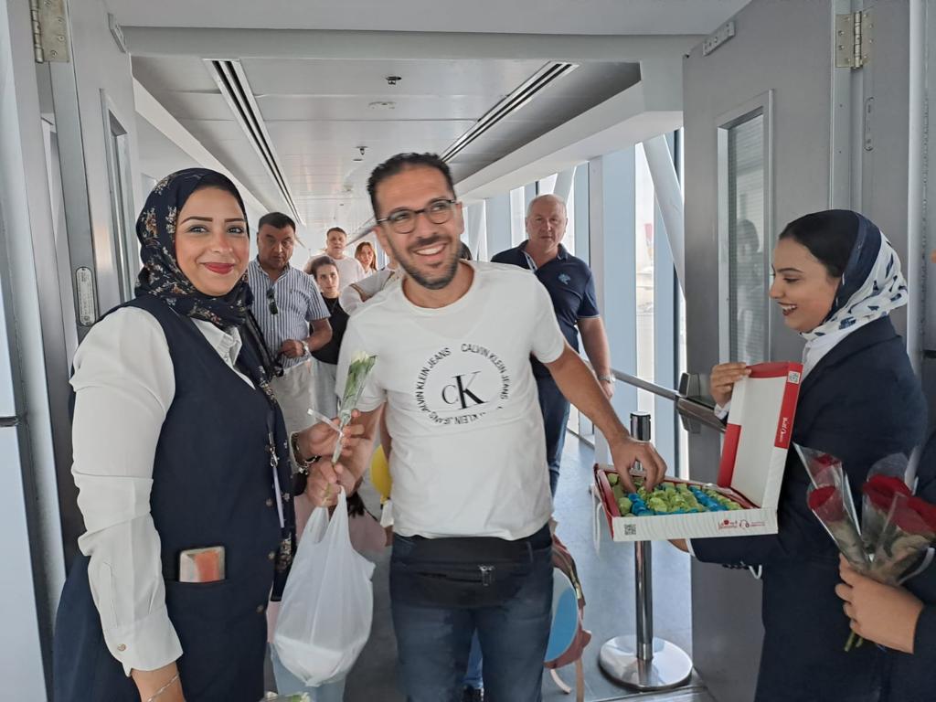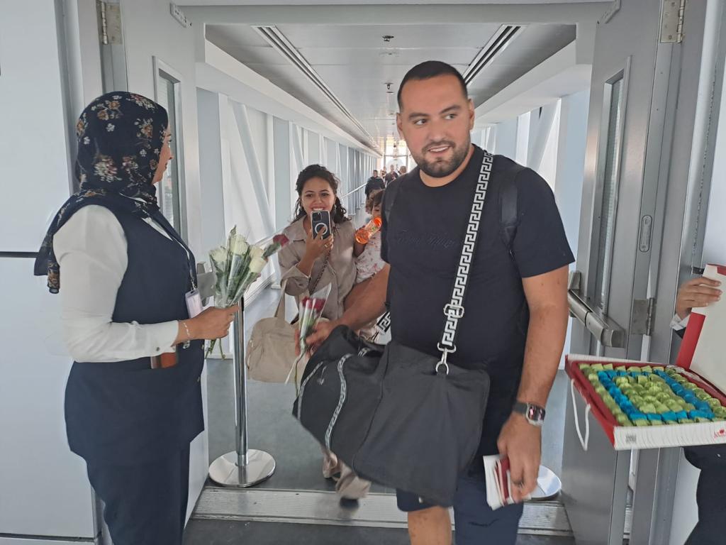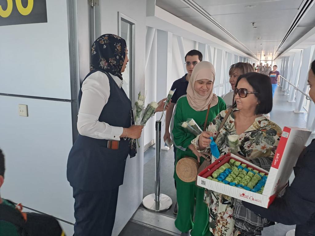 و من جانبه وجه الطيار أحمد منصور التعليمات بحسن استقبال الطائرة الجديدة و تسهيل جميع إجراءات الوصول للسائحين و بالفعل تم إستقبال الطائره بتقليد رش المياه water salute،و تم إستقبال السائحين بالورود و توزيع الهدايا التذكارية مع تمنيات فريق العمل بالمطار بقضاء اجازة ممتعة و رؤيتهم بالغردقة مرات أخرى.