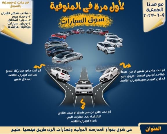 قرر اللواء إبراهيم أبو ليمون محافظ المنوفية عن دخول السيارات مجانا أول أسبوعين من إفتتاح سوق السيارات الجديد واعفاؤها من كافة الرسوم ، والمقرر افتتاحه الجمعة القادمة علي طريق شبين الكوم قويسنا مدخل قرية ميت خلف أمام مدرسة الألسن ، مشيرا الي انه سيتم تنظيمه يومى الجمعة والسبت من كل أسبوع.
