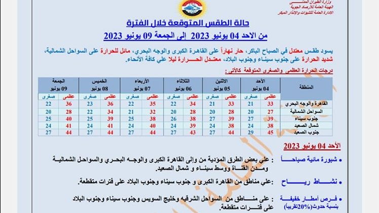 ويكون الطقس بحسب نشرة الأرصاد، مائلا للحرارة على السواحل الشمالية، شديد الحرارة على جنوب سيناء وجنوب البلاد، ويسود ليلا طقس معتدل الحرارة على كافة الأنحاء.