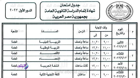 وأشارت وزارة التربية والتعليم والتعليم الفني الى أن جدول امتحانات الثانوية العامة 2023 حدد زمن الاجابة عن امتحان مادتي التربية الدينية والتربية الوطنية بساعة ونصف فقط .
