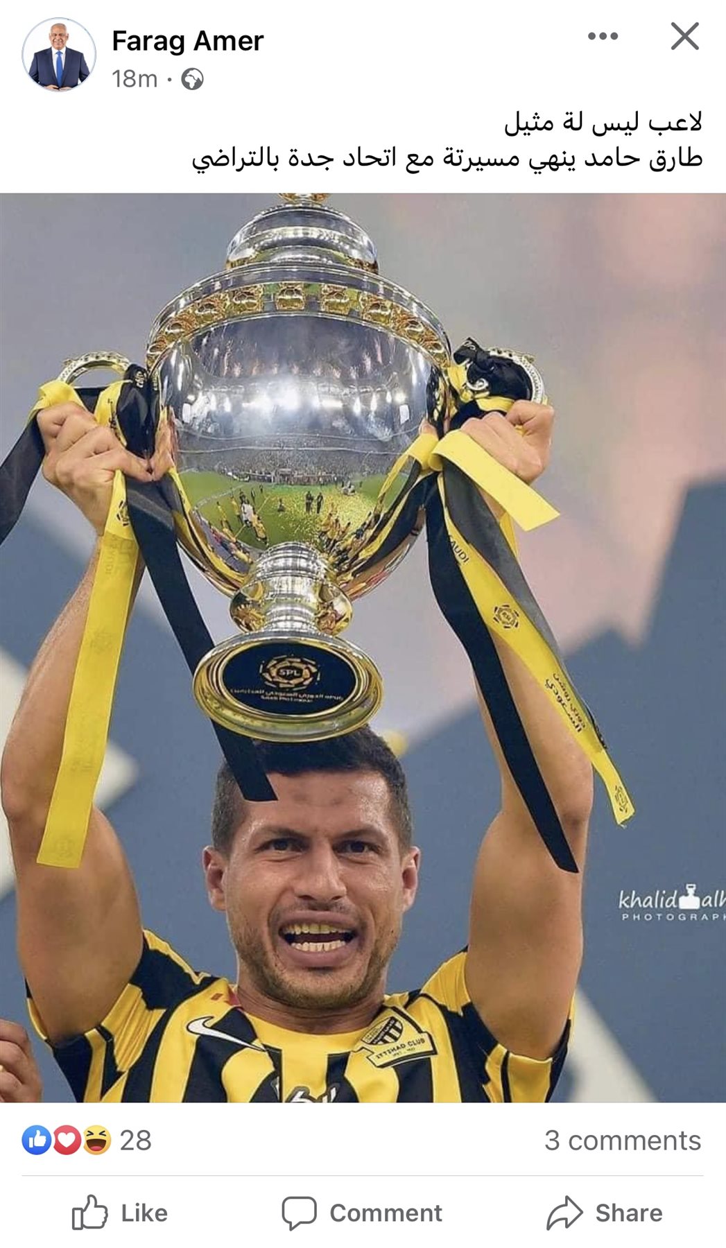 وكتب عبر فيسبوك: "لاعب ليس لة مثيل طارق حامد ينهي مسيرته مع اتحاد جدة بالتراضي".