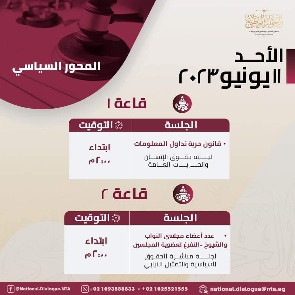 أعلن مجلس أمناء الحوار الوطني جدول جلسات المحور السياسي، المقرر عدها بعد ظهر اليوم الأحد، حيث التي تتضمن جلستين ممتدتين بالتوازي، وهما: