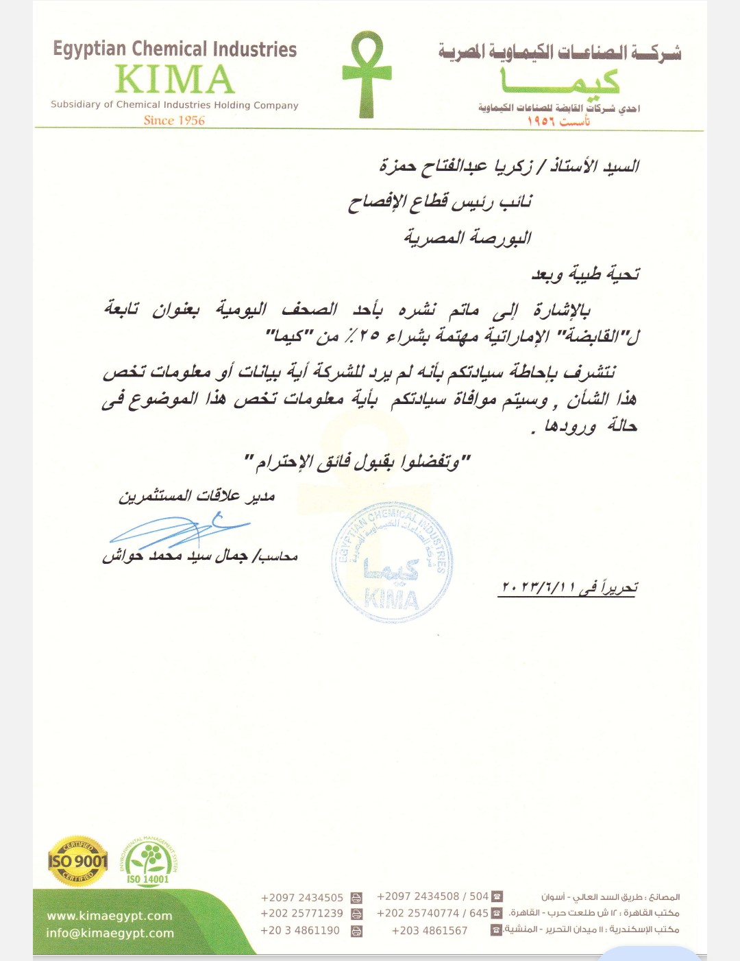 وجاء ذلك في بيان لشركة الصناعات الكيماوية المصرية - كيما إلى بورصة مصر اليوم، ردًا على ما نُشر بعنوان "تابعة للقابضة الإماراتية مهتمة بشراء 25 % من كيما".