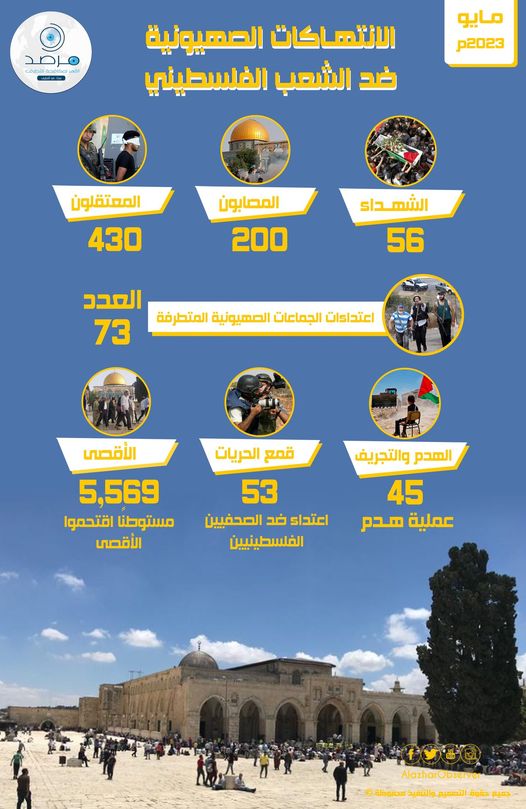 وأشار المرصد إلى أنه في محاولة لفرض واقع جديد بالقوة الجبرية، من قبل الكيان الصهيوني ومنظمات الهيكل، اقتحم نحو 5,569 مستوطن ساحات الأقصى على مدار شهر مايو تحت حراسة مشددة من شرطة الاحتلال، مرددين النشيد الوطني الصهيوني "هتيكفا" بشكلٍ جماعي في قلب المسجد المبارك.