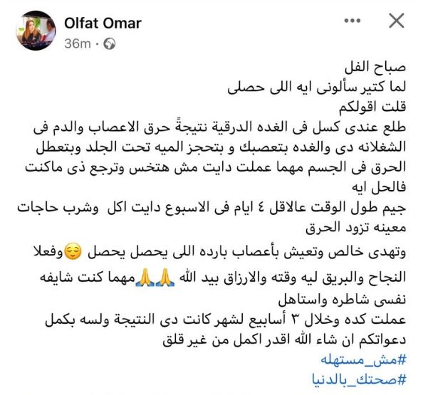 وعلقت “ ألفت عمر ” قائلة : صباح الفل لما كتير سألوني إيه اللي حصلي قلت أقولكم.. طلع عندي كسل في الغدة الدرقية نتيجة حرق الأعصاب والدم في الشغلانة دي، والغدة بتعصبك وبتحجز الميه تحت الجلد وبتعطل الحرق في الجسم مهما عملت دايت مش هتخس وترجع زي ما كنت.