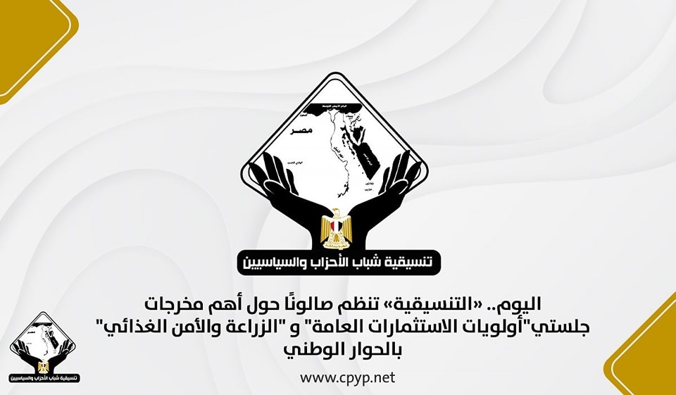 تنظم تنسيقية شباب الأحزاب والسياسيين، صالون نقاشي، اليوم في السابعة مساءً، لمناقشة مخرجات جلستي "أولويات الاستثمارات العامة وسياسة ملكية الدولة" و "لجنة الزراعة والأمن الغذائي" في المحور الاقتصادى بالحوار الوطني، وذلك في إطار الفعاليات التي تنظمها التنسيقية، حول القضايا المطروحة ضمن الحوار الوطني.