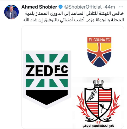 وكتب أحمد شوبير: خالص التهنئة للثلاثي الصاعد إلي الدوري الممتاز بلدية المحلة والجونة وزد.. أطيب أمنياتي بالتوفيق إن شاء الله.