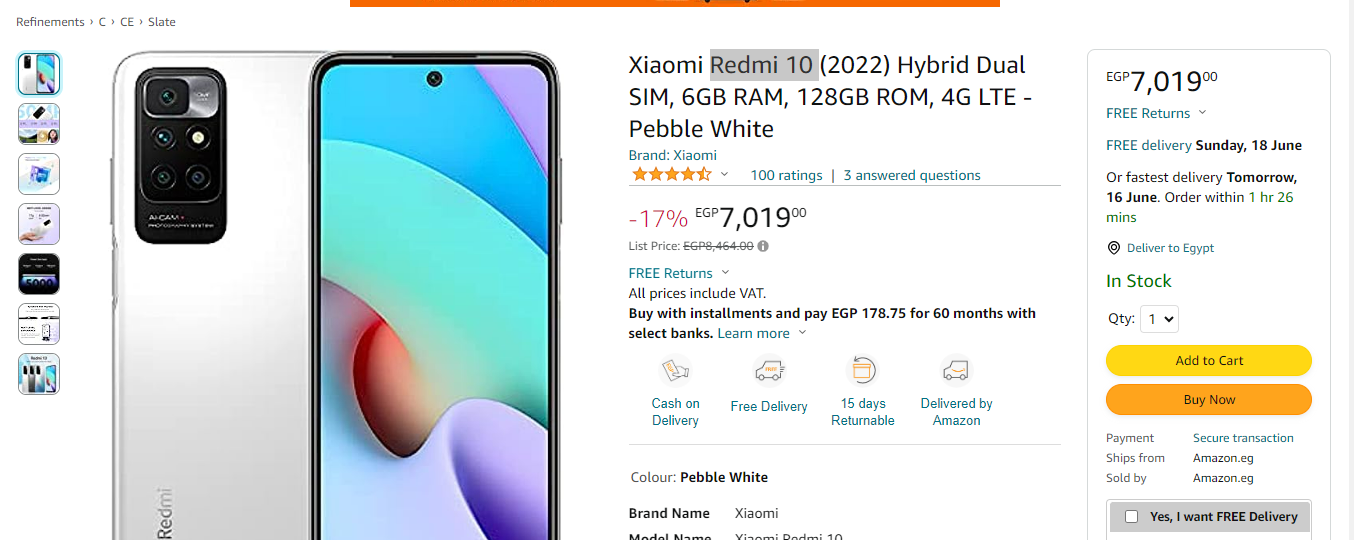 يتوفر حاليا موبايل شاومي ريدمي 10 على موقع أمازون مصر بخصم كبير 17%، ويباع حاليا بسعر 7,019 جنيه فقط، وذلك مع إصدار الذاكرة العشوائية وسعة التخزين 6GB RAM, 128GB ROM، في السطور التالية نرصد كل تفاصيله.