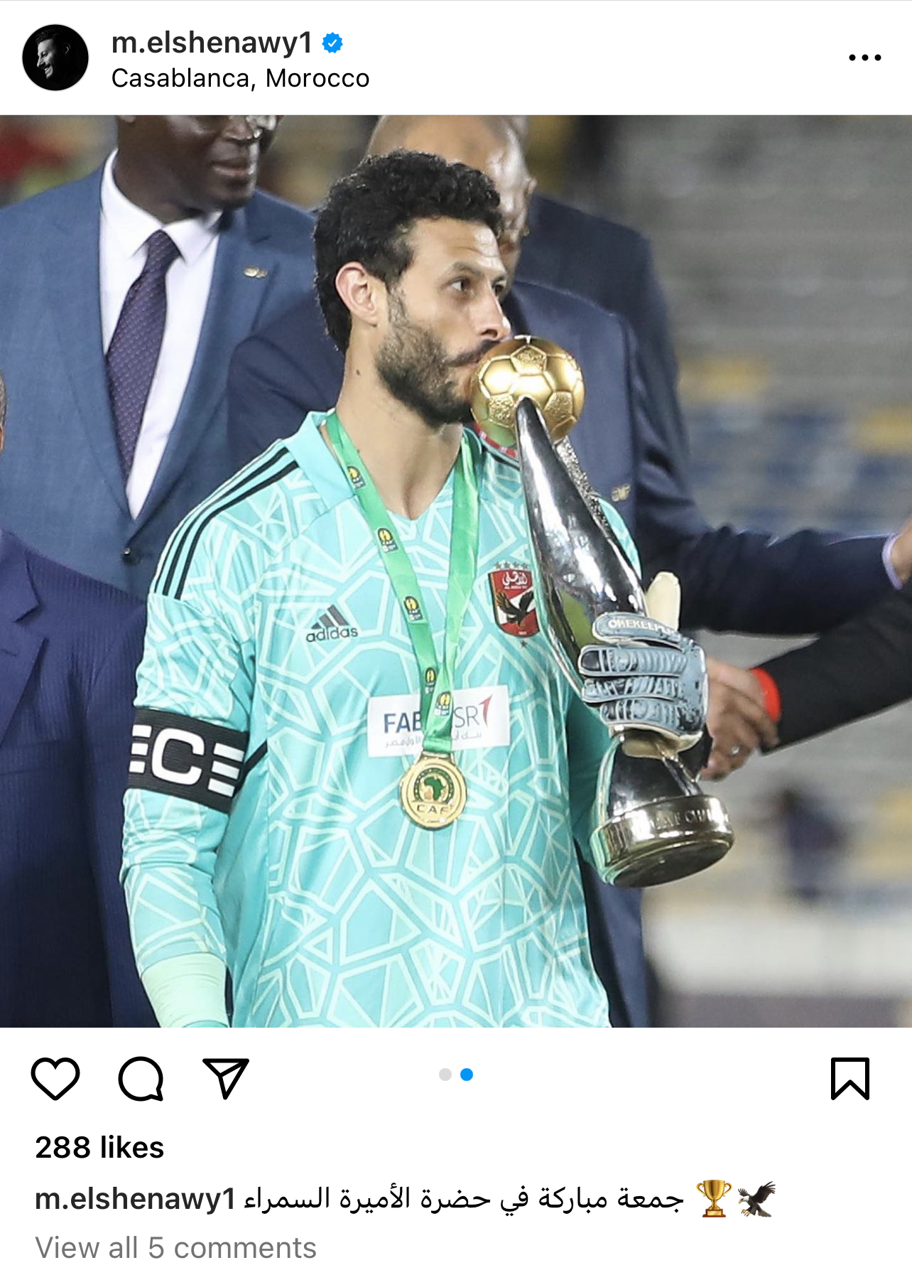 نشر محمد الشناوي، حارس مرمي النادي الأهلي، صورًا من احتفاله بالتتويج بلقب دوري أبطال أفريقيا، عبر حسابه الشخصي بموقع التواصل الاجتماعي “إنستجرام”.