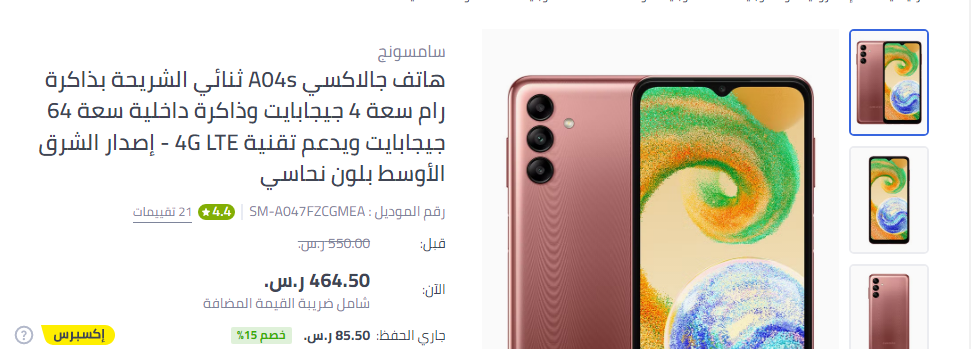 ولحسن الحظ، حصل إحدي هواتف سامسونج المتوسطة الفئة، والذي ينطلق تحت اسم جالاكسي A04s في كل من مصر والسعودية والإمارات، على خصم كبير على أحد مواقع التجارة الالكترونية على الويب في السعودية.