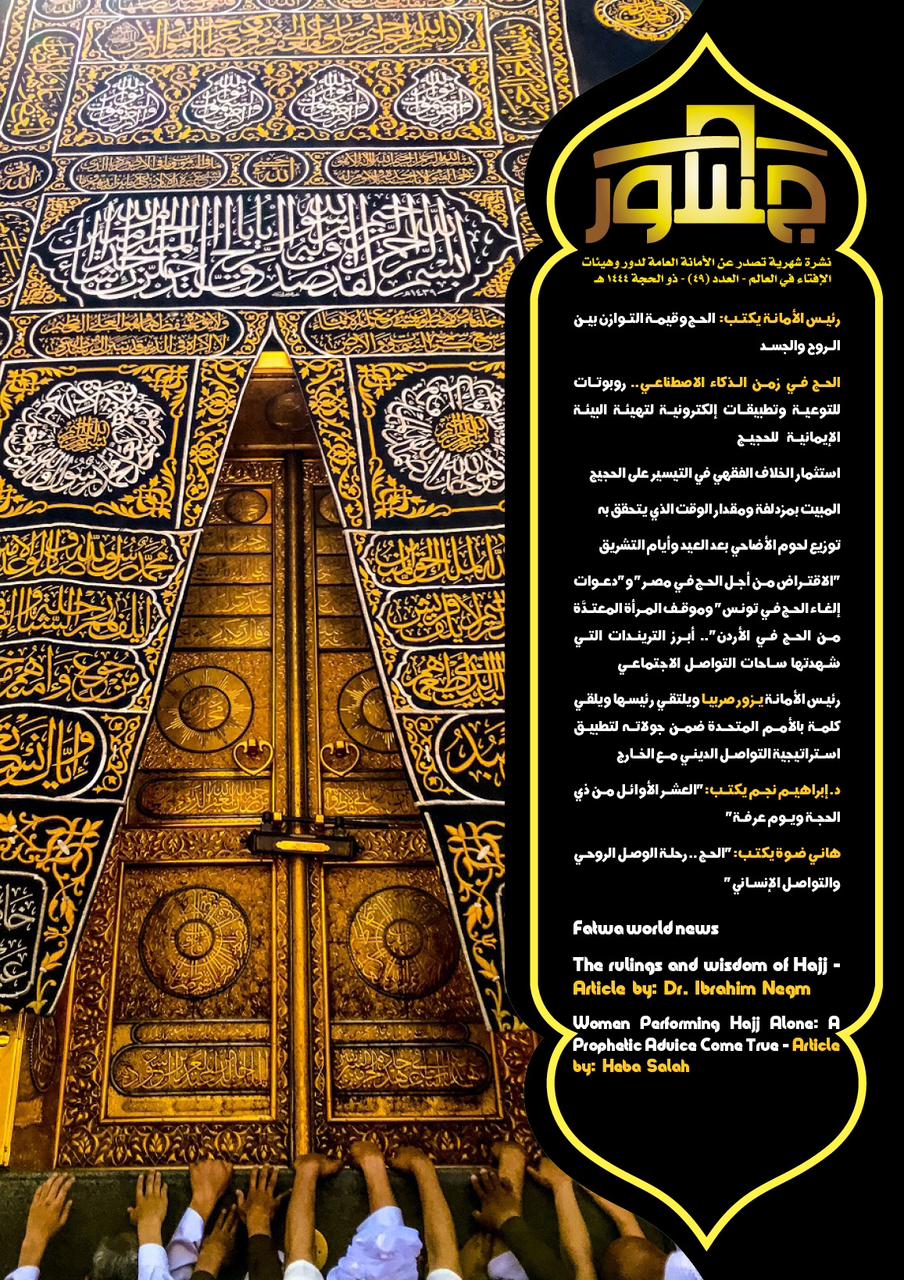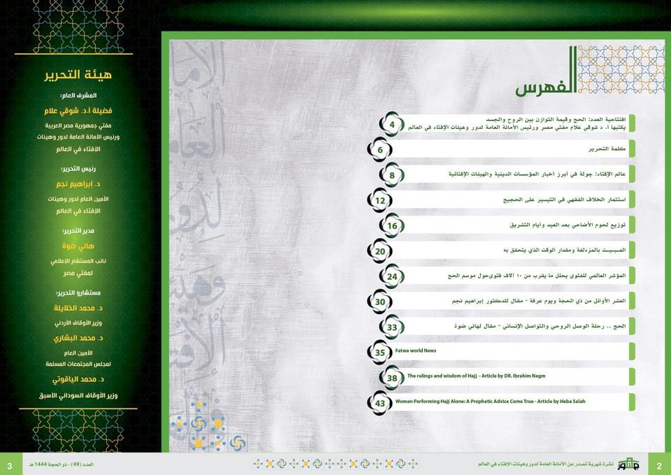 وكتب افتتاحية العدد الدكتور شوقي علام -مفتي الجمهورية، رئيس الأمانة العامة لدُور وهيئات الإفتاء في العالم- تحت عنوان: "الحج وقيمة التوازن بين الروح والجسد"، يتحدث فيه عن أن الإسلام دين يقترب من الفطرة الإنسانية السليمة ويوازن في أحكامه ومقاصده بين عناصر الشخصية البشرية بطريقة متكاملة لا يستغني عنها الإنسان، وكيف أن أحكام شعيرة الحج تحقق التوازن الحكيم والتوافق الفريد والانسجام الشامل بين متطلبات الروح وحاجات الجسد، وبين النزعة الفردية والمصالح المجتمعية، فالحاج مأمور أن يوازن بين الحقوق والواجبات.