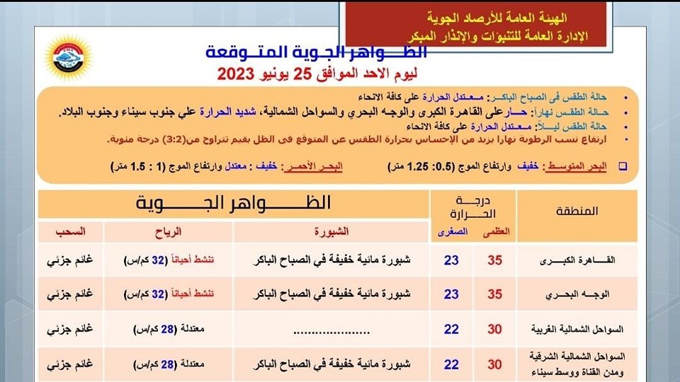 توقع خبراء هيئة الأرصاد الجوية أن يسود، اليوم الأحد، طقس حار نهارا على القاهرة الكبرى والوجـه البحري والسواحل الشمالية، شديد الحرارة على جنوب سيناء وجنوب البلاد.. بينما يسود طقس معتدل الحرارة ليلا على الأنحاء كافة.